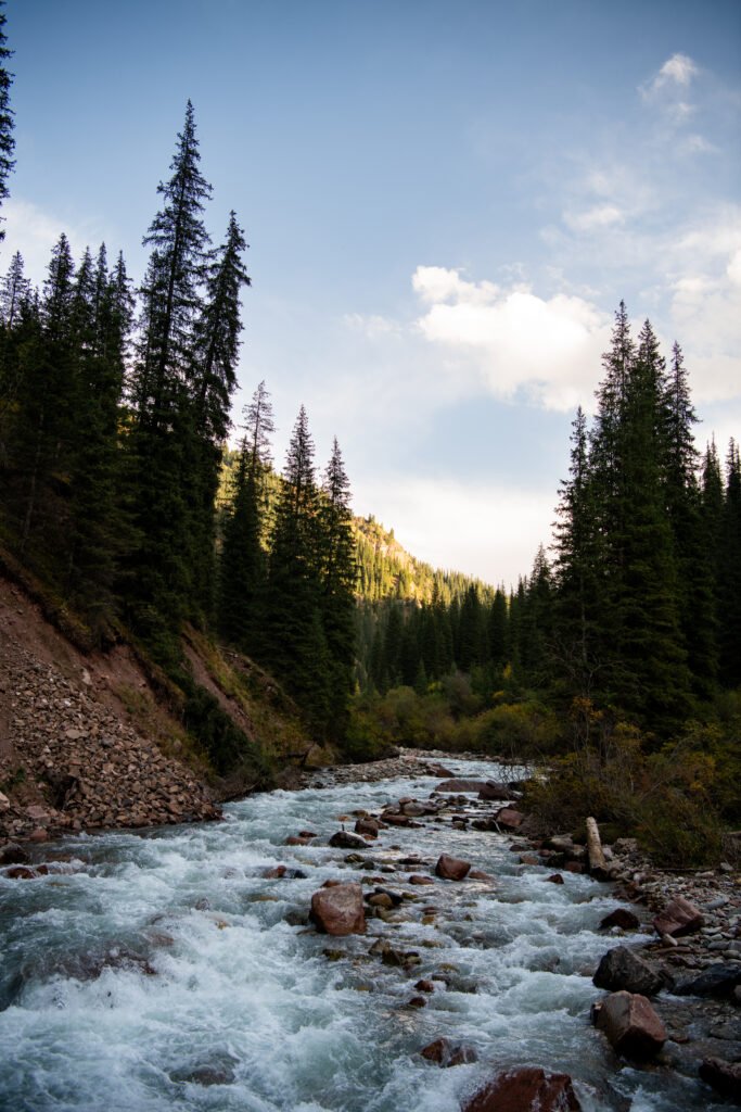 It was a perfect blue-sky day when we stopped in a valley surrounded by mountains, their slopes covered with pine trees. The bucolic scene was completed by a river cutting through the land with its emerald-green water.
