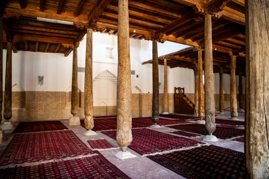 That introduction to Bukhara’s cleaner architectural language wasn’t over yet. The Bolo-Hauz Mosque is famous for its finely carved wooden columns, supporting a remarkably high roof that shelters the iwan — elegant, measured, and quietly confident.
