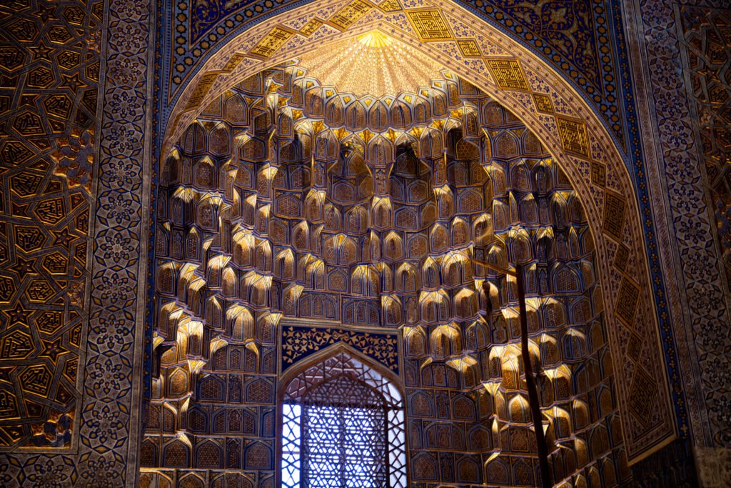 Up close, it becomes even more impressive. Inside the iwan and along the walls, a perfect balance of arabesques, calligraphy and the unique muqarnas unfolds — a cascade of geometric cells, as if the dome itself were slowly breaking into light.